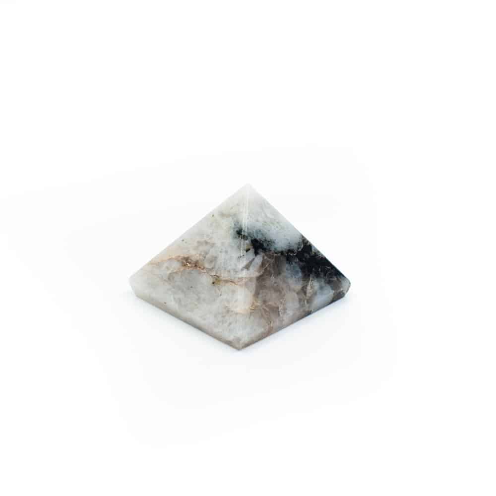 Edelsteinpyramide von ca. 25 x 25 mm aus Regenbogenmondstein. Dies ist ein Naturprodukt. Rainbow Moonstone kommt in verschiedenen Formen und Größen, so dass jede Pyramide wird eine andere Textur haben. Mondstein Regenbogen steht für Intuition, Aufmerksamkeit, Wachsamkeit und ist aufschlussreich. Der Mondstein ist ein Feldspat mit Perlglanz und kann in der Farbe von silbrigem Weiß mit bläulichen Reflexen und sanften Tönen bis zu rötlichem Beige, Gelbgrün oder sogar Schwarz variieren. Der Stein weist natürliche Unebenheiten auf, auch wenn er geschliffen und poliert ist. Dem Mondstein wird eine starke Verbindung zum Mond und seinen Zyklen nachgesagt. Er könnte eine beruhigende Wirkung haben...