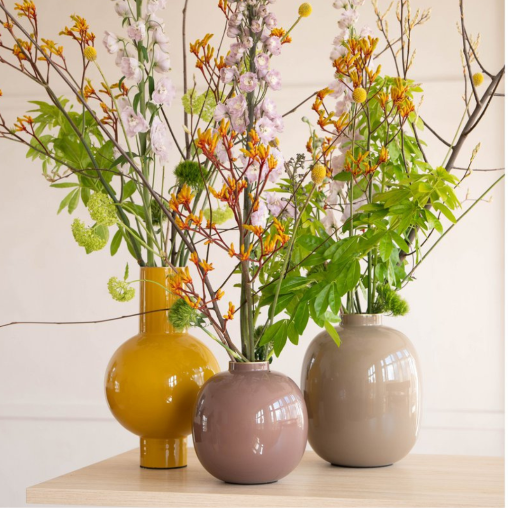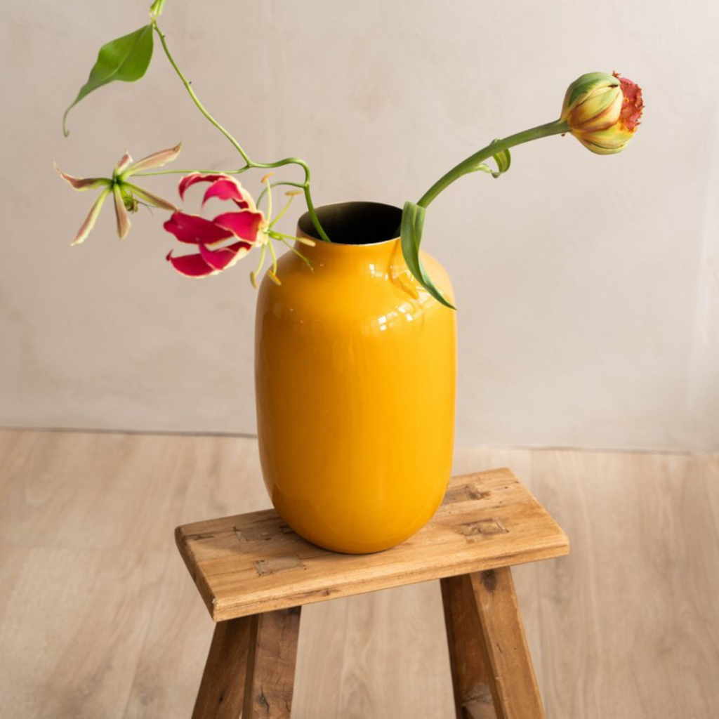 Diese gelbe ovale Metallvase aus der Kollektion Blushing Birds lässt Ihre Blumen besonders hübsch aussehen.
