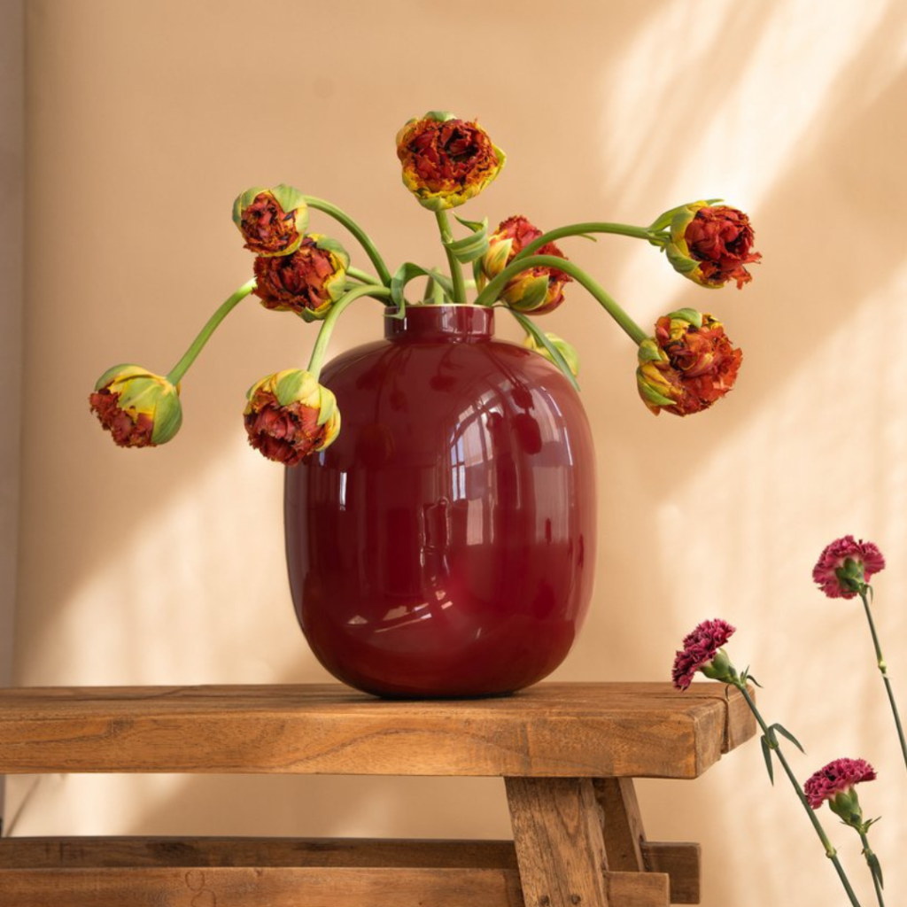 Bringen Sie Farbe in Ihr Zuhause mit dieser dunkelroten Metallvase. Diese Vase lässt jeden Blumenstrauß umwerfend aussehen.