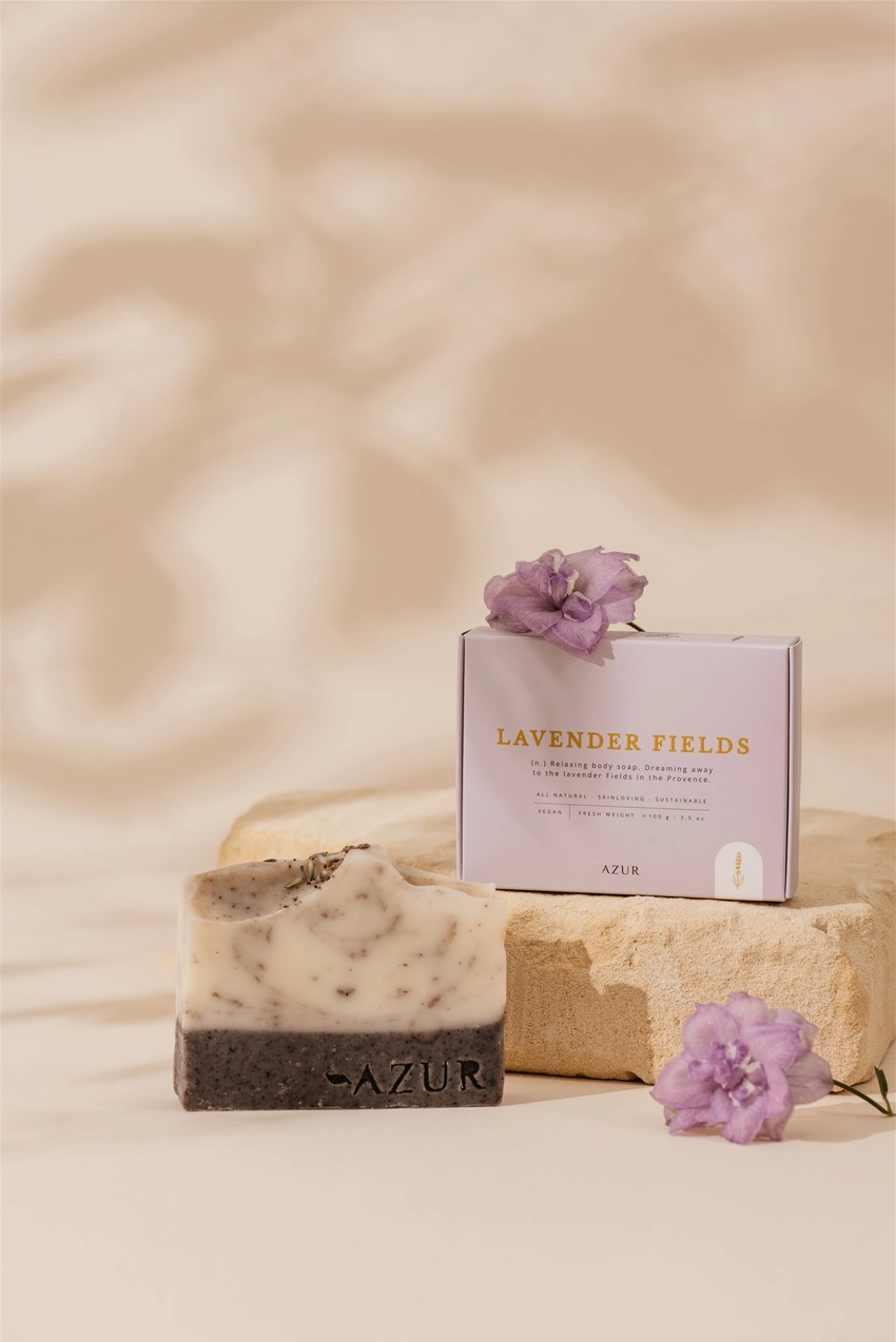De Lavender Fields Body Bar is verrijkt met voedende plantaardige oliën, sheaboter en cacaoboter voor een zachte en verzorgde huid. Kaolien klei helpt de huid licht te zuiveren, terwijl lavendelbloemen en maanzaad zorgen voor een subtiele scrub. De paarse tint komt rechtstreeks uit de natuur – dankzij alkanetwortelpoeder.