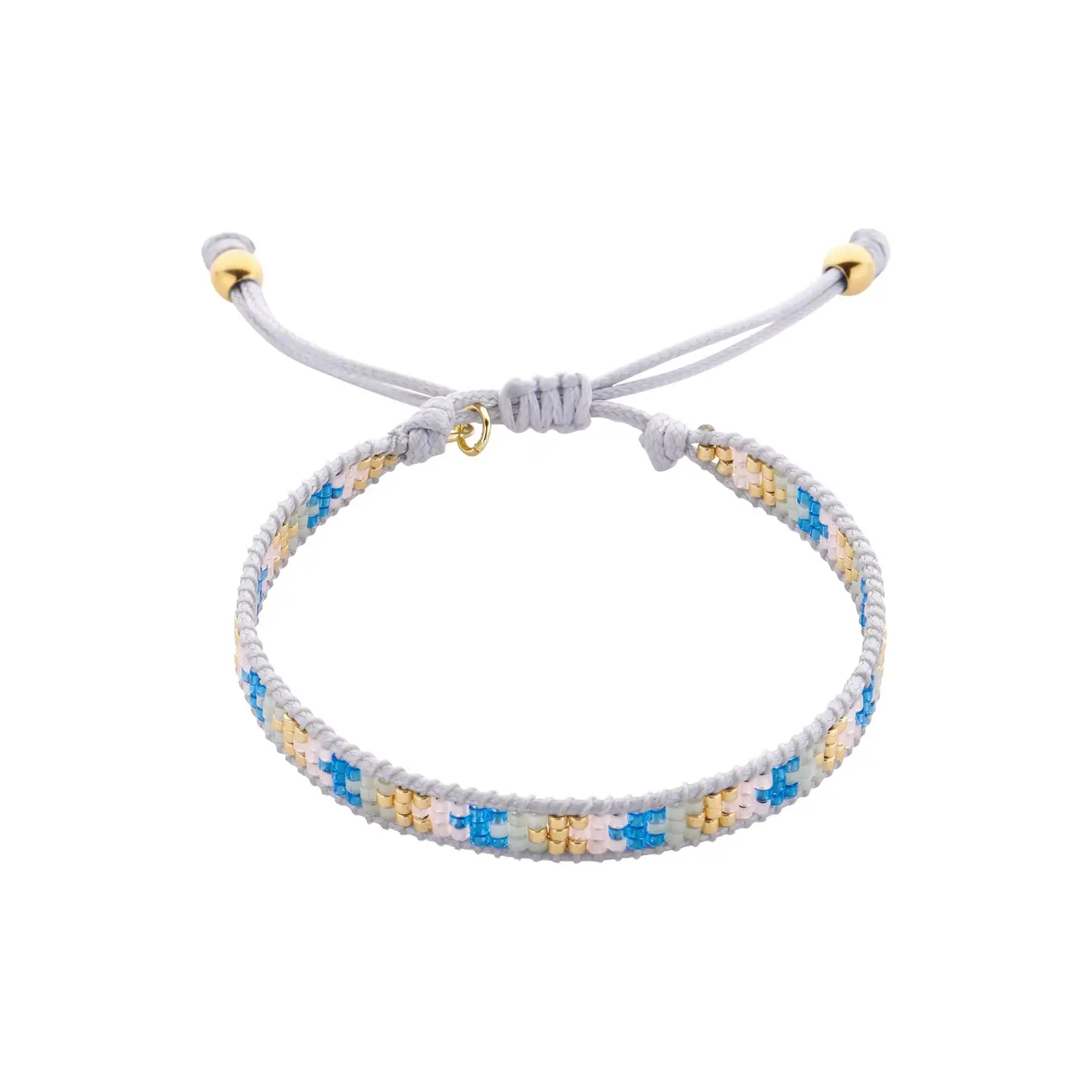 Leuke armband geweven. Gemaakt van nylon en miyuki glas kraaltjes. Je kunt de armband op maat stellen door het touwslotje aan de achterkant van de armband. Deze kun je open en weer dicht schuiven voor de gewenste maat! Leuk om te combineren met onze andere armbanden.