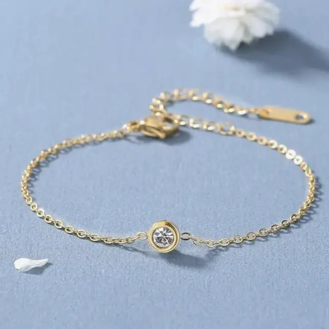 Mooie armband van Roestvrij staal met een 14k plating laagje. De armband bestaat uit zeer fijn materiaal met als leuk detail in het midden een zirkonia steentje. De armbanden bevatten een karabijn slotje en een verlengketting van ongeveer 5 cm. Leuk om te combineren met onze andere sieraden.