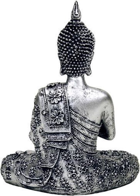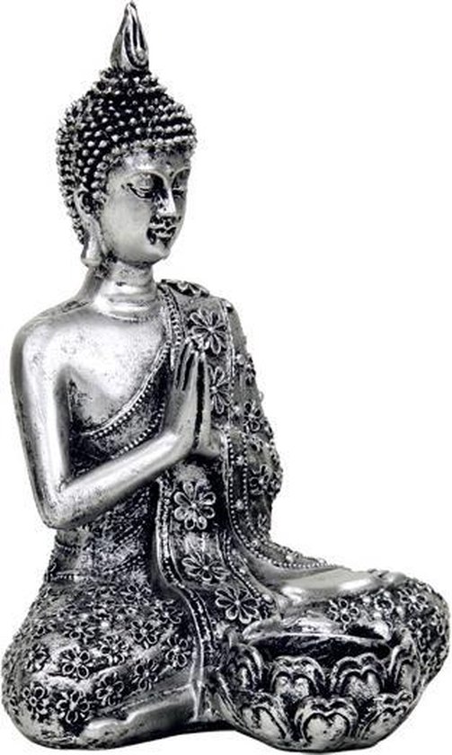 Mediterende Boeddha met kaarshouder – zilverkleurig Voor waxinelichtjes. Materiaal: Polyresine. -Boeddha met kaarshouder zilverkleurig – 20.5 – Polyresin Afmetingen: 20.5 cm –