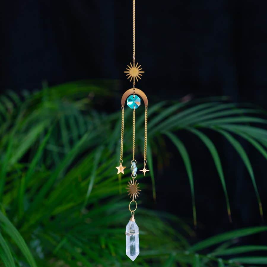 Die Kombination von Sonne, Mond und Bergkristall in diesem Anhänger schafft ein kraftvolles und bedeutungsvolles Stück, das positive Energie und Gleichgewicht in Ihre Umgebung bringt. Hängen Sie den Edelstein-Regenbogen-Anhänger - Sonne und Mond - Bergkristall an einem besonderen Ort in Ihrem Zuhause auf, zum Beispiel an einem Fenster oder in der Nähe einer Lichtquelle, damit er die Energie von Sonne und Mond einfangen und verbreiten kann.