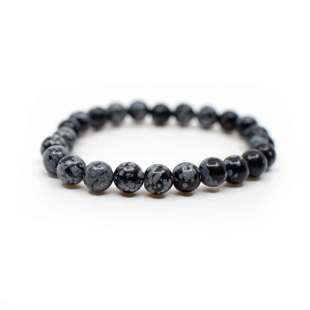 Obsidian Schneeflocken Armband, 8 mm Perlen. Obsidian ist ein weich wirkender Stein, der für inneren Frieden und Gelassenheit steht. Man sagt, dass er dazu ermutigt, einmal spontan zu handeln und alle negativen Gedanken über sich selbst loszulassen.
