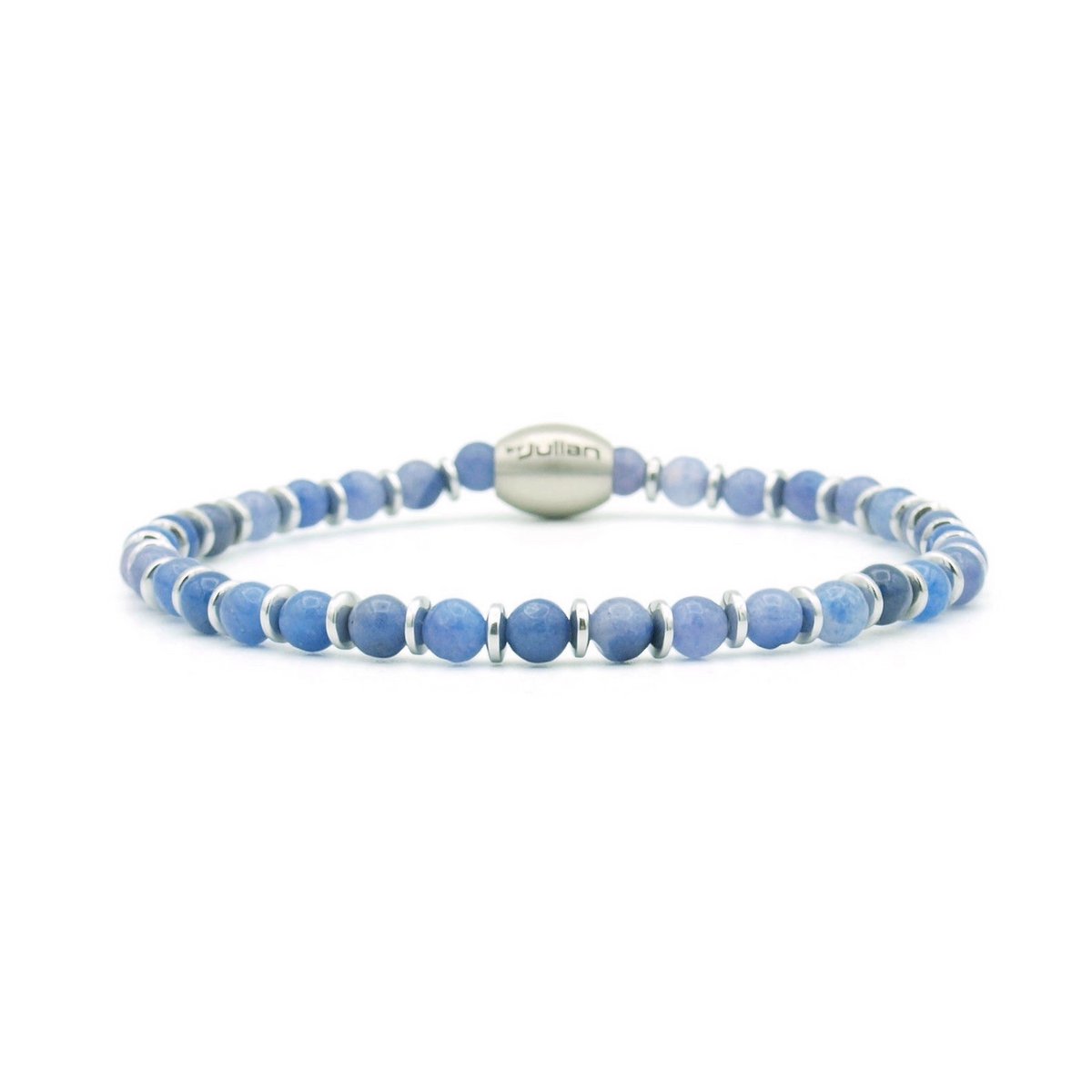 Deze armband is gemaakt van 4 mm blauwe kwarts kralen en zilveren of gouden hematiet rondellen. Afgewerkt met een by Julian rvs logo kraal en geregen op sterk elastisch nylon draad.