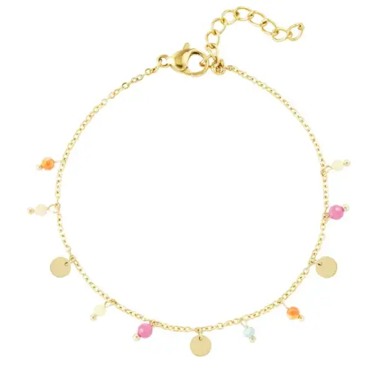 Heel mooi enkelbandje gemaakt van roestvrij staal met een 14k gouden laagje plating. Aan het enkelbandje hangen bedels ook gemaakt van roestvrij staal en hoogwaardige materialen zoals natuursteen en zoetwater parels. Het materiaal verkleurd niet en is waterproof waardoor er ook met het enkelbandje gedoucht en gezwommen kan worden. Het enkelbandje bevat een verlengkettinkje van 5 centimeter waardoor het in maat versteld kan worden. Kijk ook voor onze bijpassende armbandjes.