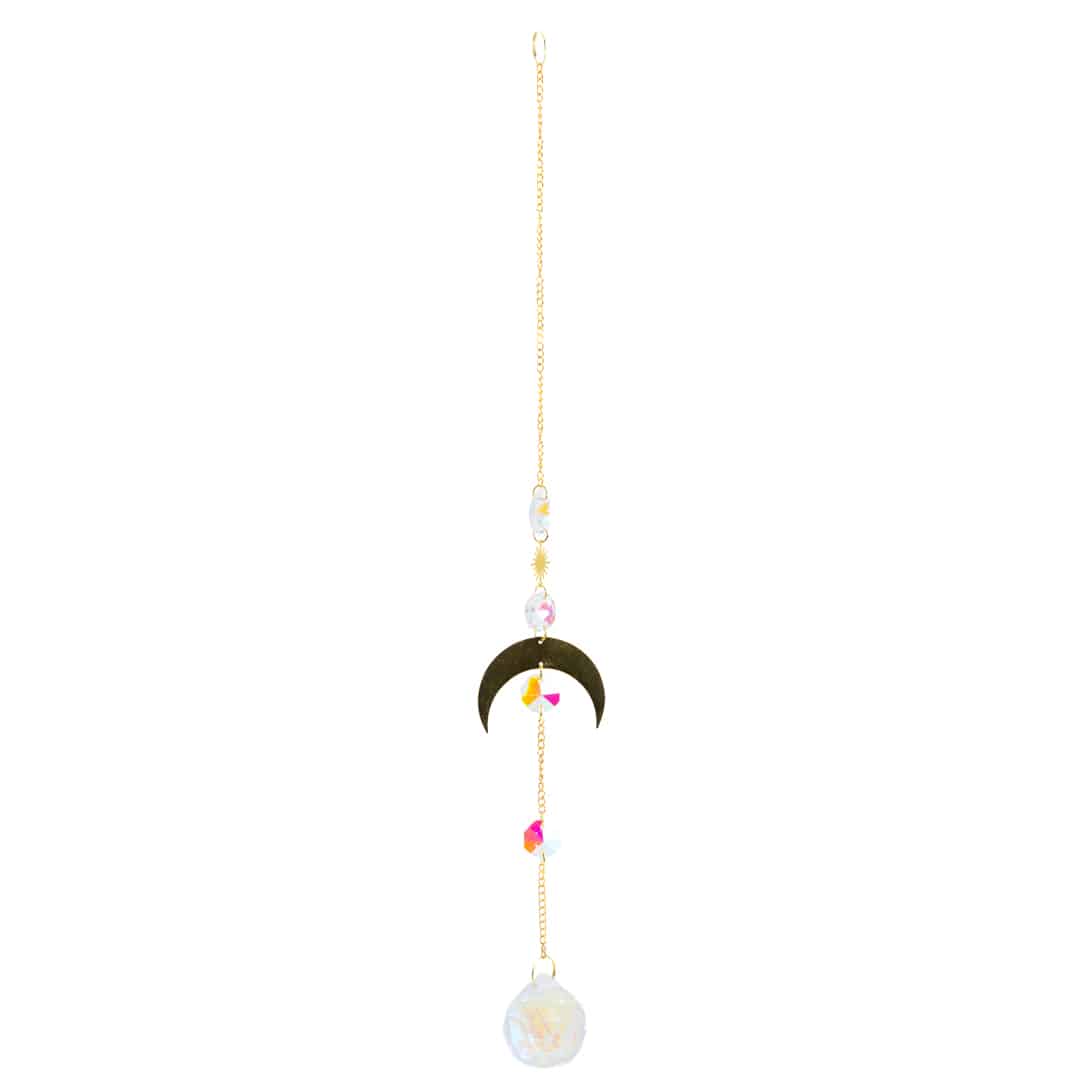 Een unieke raamhanger met meerdere regenboogkristallen en halve maan. Het Regenboogkristal is heel bijzonder. Het schittert en straalt, en wanneer het zonlicht er doorheen valt, zie je ineens een prachtige regenboog. Deze regenboog leidt je naar je eigen veilige plek. Een plek waar je je eigen veerkracht, weerbaarheid en eigenwaarde kunt versterken. Een plek waar je kunt ontladen en helemaal jezelf kunt zijn. Zo laat het Regenboogkristal ook jou weer schitteren. Regenboogkristallen brengen licht en leven in huis! Via de geslepen facetvlakken wordt het zonlicht gebroken in regenboogkleuren, die door de hele kamer dansen. Degene die de woon- of werkruimte volgens de leer van Feng Shui wil inrichten kan niet om deze hulpmiddelen heen. De moeilijkste hoeken kunnen erdoor worden ‘gebroken’. Ze kunnen opgehangen worden in elk raam waar zonlicht op valt. Probeer het maar, en laat je betoveren door het steeds weer nieuwe kleurenspel! Feng Shui In de Feng Shui worden allerlei producten gebruikt om de energiestroming te beïnvloeden en ook om negatieve energie te neutraliseren. Deze regenboogkristallen zijn hier een goed voorbeeld van. Feng Shui (spreek uit als: fang sjwie) is de meer dan 3.000 jaar oude filosofie die leert hoe de omgeving het geluk kan beïnvloeden. Feng Shui leert welke invloeden vormgeving en inrichting op het welzijn en geluk van de mens hebben, en ook hoe negatieve invloeden veranderd kunnen worden in positieve. Feng Shui gaat over de relatie tussen de mens en de leef- of werkomgeving en is gericht op harmonie tussen natuurlijke en gecreëerde vormen. Alles wat de mens maakt is in wezen niet natuurlijk, maar kan wel met die natuur in harmonie gebracht worden. Het doel van Feng Shui is om onze leef- of werkomgeving zo aan te passen dat een harmonieuze stroming van de Chi (levenskracht) gestimuleerd wordt. In de Chinese filosofie draait alles om harmonie en evenwicht tussen de complementaire krachten yin en yang, zoals mannelijk en vrouwelijk.
