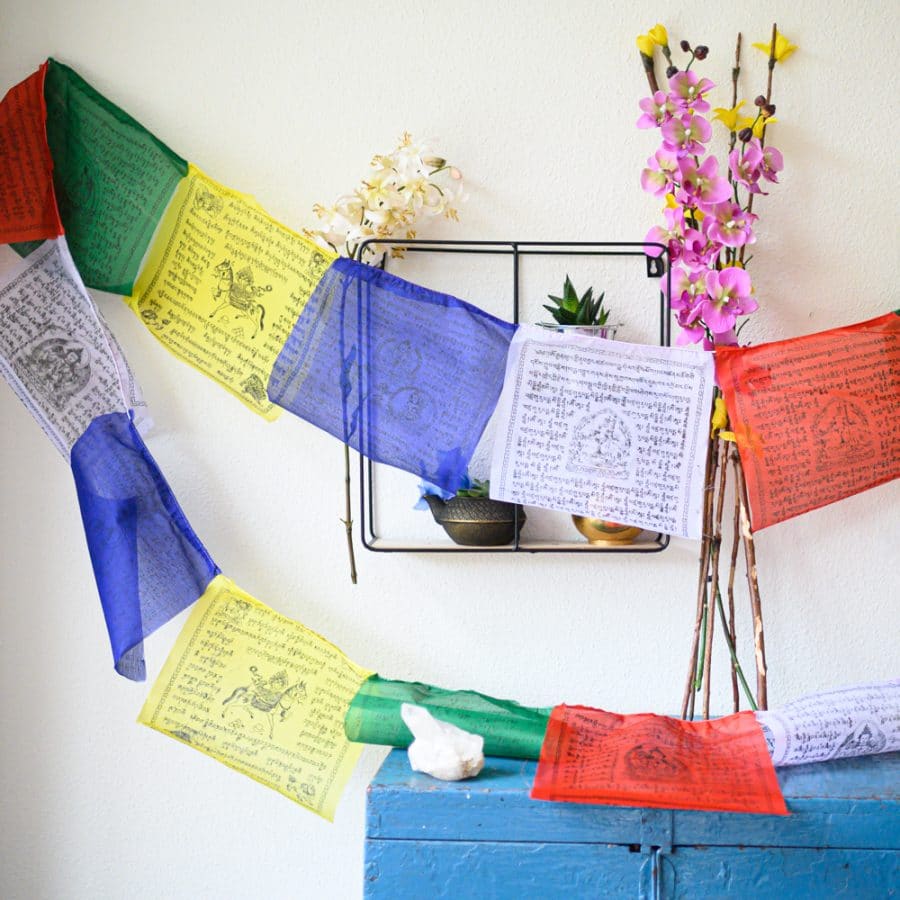 In de kleuren wit, rood, blauw, geel en groen. In het Tibetaans boeddhisme zijn de gebedsvlaggen niet weg te denken. Volgens de traditie worden de gebeden die op de vlaggen zijn gedrukt verspreid door de wind en geven zodoende een positieve bijdrage aan de omgeving.