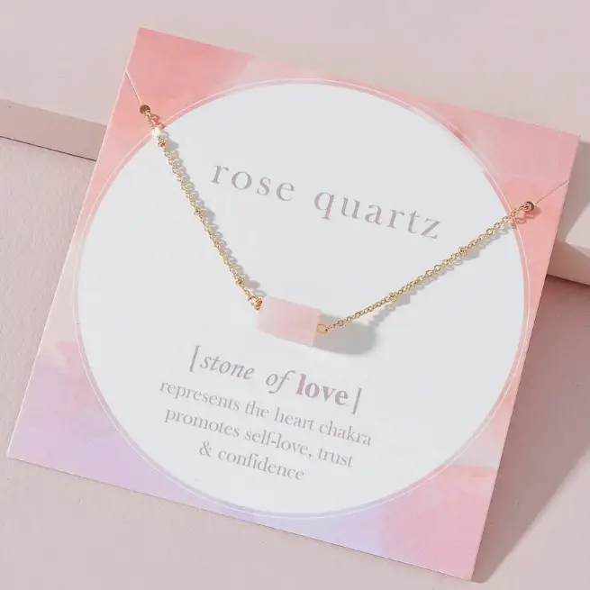 Prachtige ketting gemaakt van Roestvrij staal met een 14k laagje plating. De ketting is zeer fijn. De hanger is ook van roestvrij staal en natuursteen. De hanger is van rozenkwarts. Het kaartje wordt erbij geleverd. Leuk om te combineren met onze andere minimalistische sieraden.