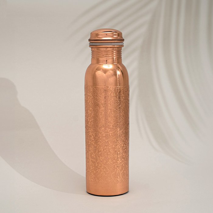Handgefertigte Wasserflasche aus Kupfer mit eingraviertem floralem Muster