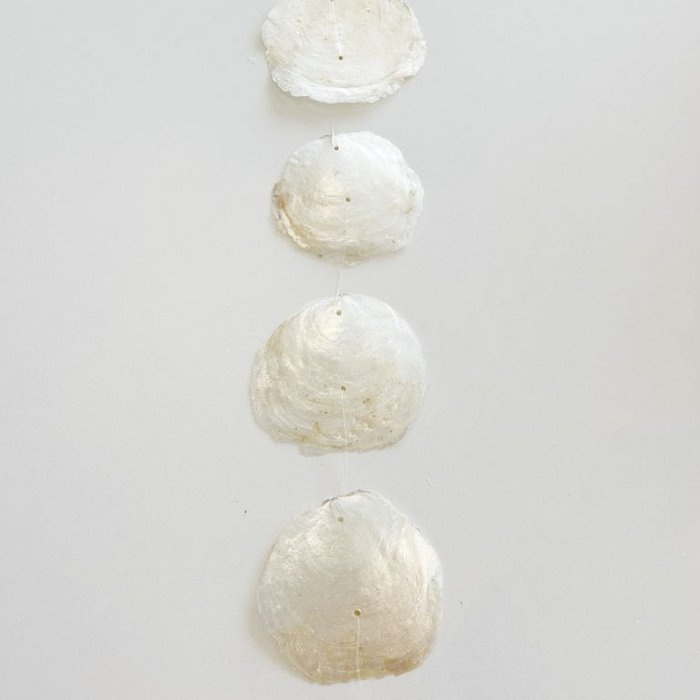 Capiz-Muscheln sind bekannt für ihre leichte Transparenz und Perlglanz. Aufgrund des handwerklichen Herstellungsprozesses und der Verwendung natürlicher Materialien können Farbe und Textur von Girlande zu Girlande leicht variieren. Dies verleiht jeder Girlande einen einzigartigen Charakter.