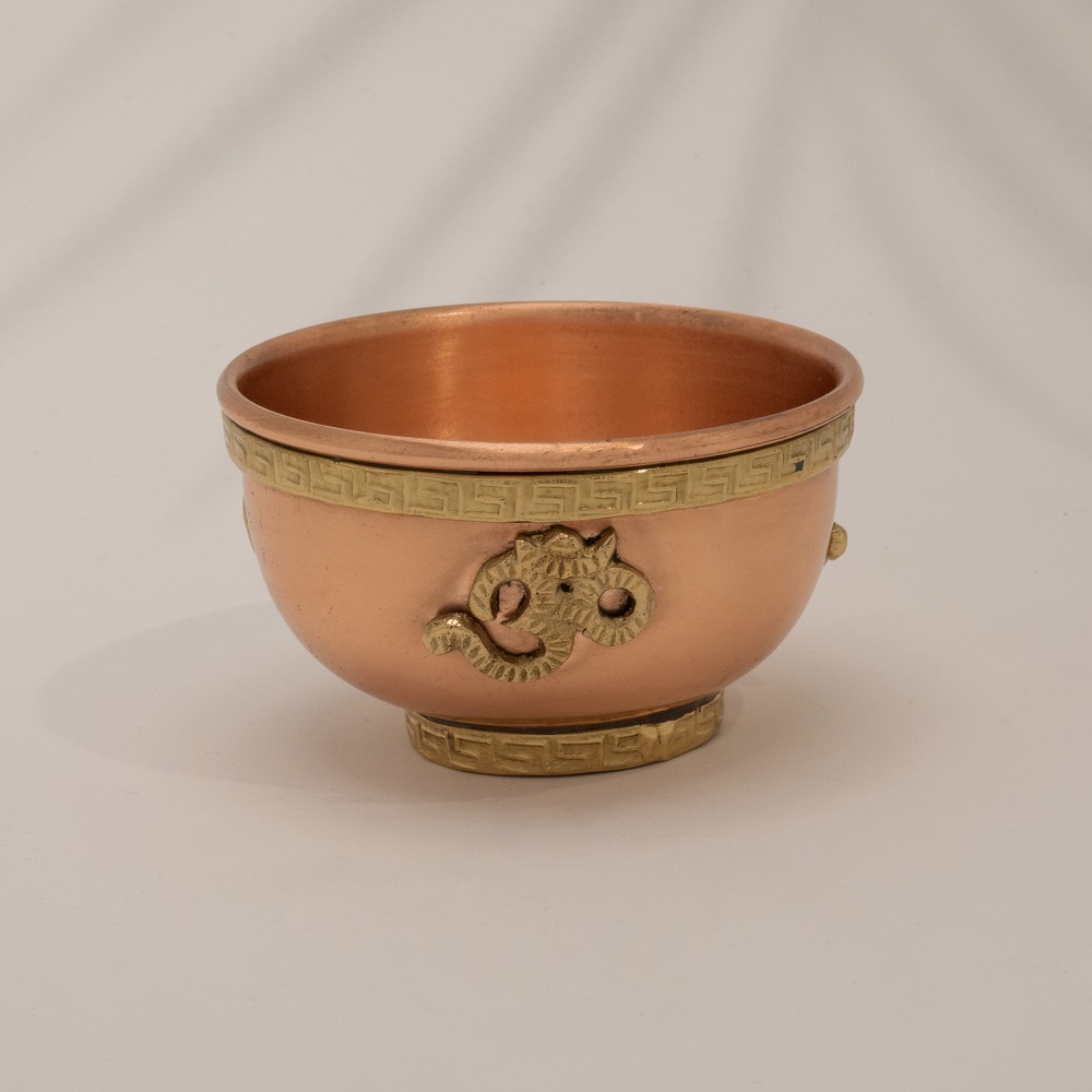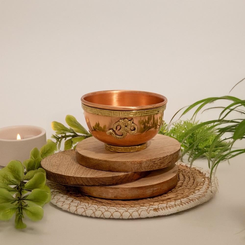 Bringen Sie Atmosphäre, Bedeutung und Spiritualität zusammen mit dieser handgefertigten Opferschale aus Kupfer mit OHM-Symbol. Ideal für Meditation, Rituale und Entspannung, kann dieser vielseitige Gegenstand auch als Räuchergefäß oder Teelichthalter verwendet werden.