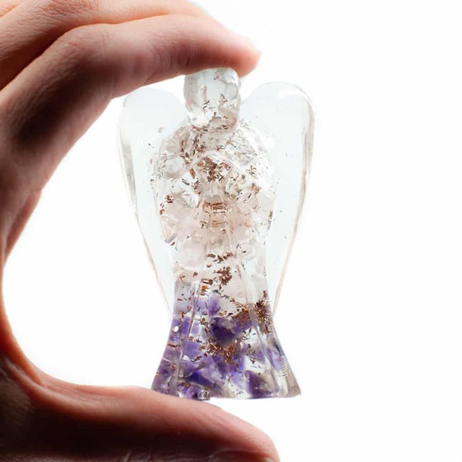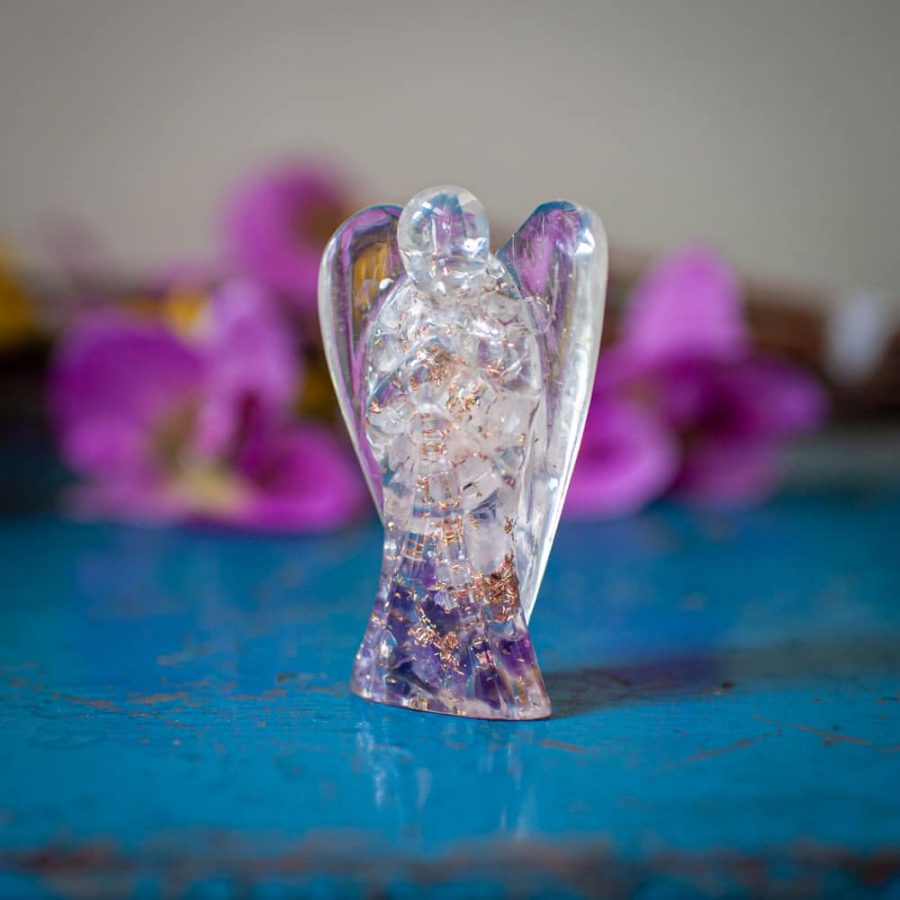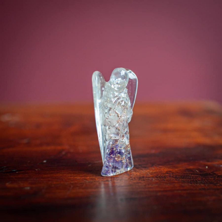 Een engel is een bovennatuurlijk, verstandelijk wezen, dat wordt teruggevonden in verscheidene (vaak monotheïstische) religies. In het christendom, de islam, het jodendom en zoroastrisme, treden engelen, als bedienden of beschermers van de mens, gewoonlijk op als boodschappers van God (of de goden), van wie ze duidelijk zijn onderscheiden, en beschikken over bovenmenselijke capaciteiten en eigenschappen. In andere religies worden bovennatuurlijke wezens soms vergeleken met engelen, omdat zij enkele kenmerken met engelen gemeen hebben en gelden als engelachtigen. Deze prachtige Orgone Edelstenen engel bestaat uit onder andere de edelstenen Amethist, Rozenkwarts en Bergkristal. De engel is ca. 7 cm hoog.