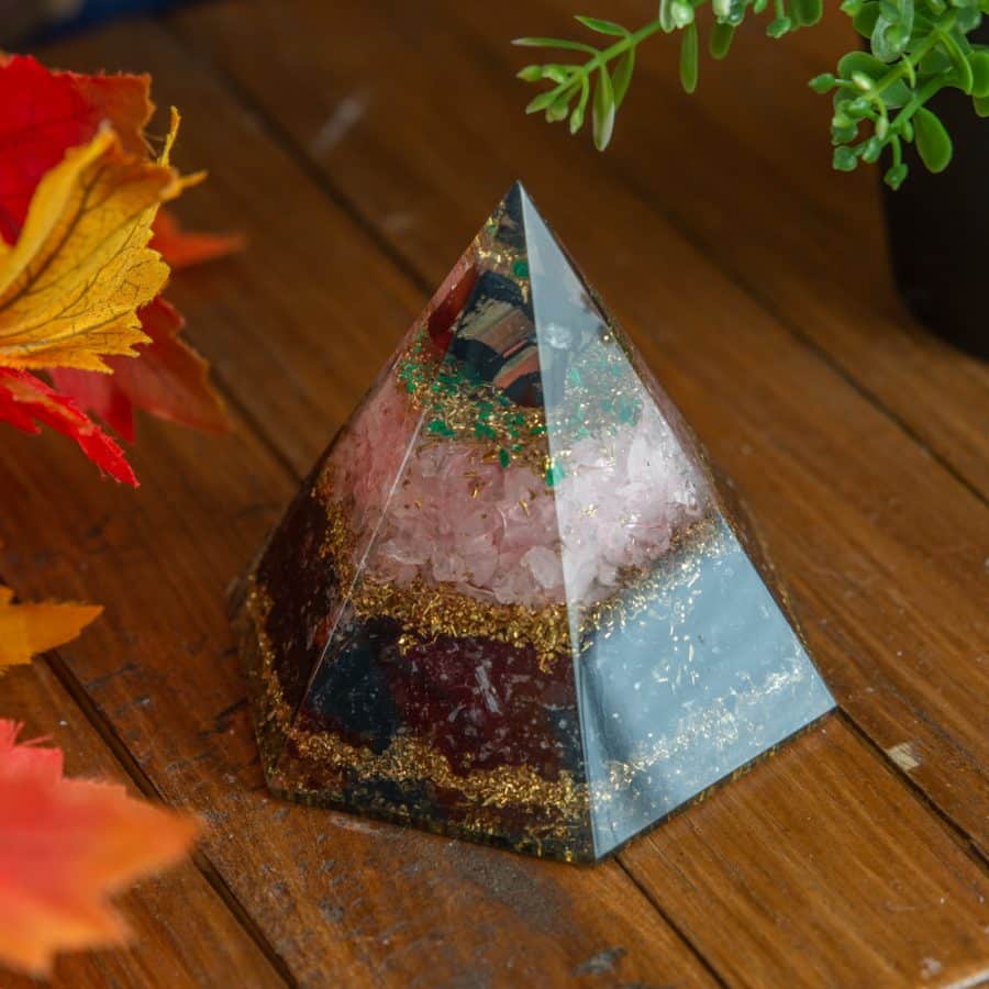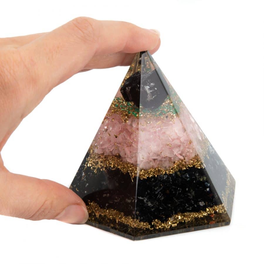 Eine schöne Orgonit-Pyramide mit sechs Seiten. Die Pyramide enthält schwarze Turmalin und Rosenquarz Edelsteine. An der Spitze ist ein größeres Stück rohen schwarzen Turmalin. Orgon bedeutet Lebensenergie (Chi, Äther oder Prana). Es besteht aus einer Kombination von Kristallen, Harz und Metallen. Es wird gesagt, dass es die Energie reinigt und ausgleicht und das Chi in uns und um uns herum harmonisieren kann. Fachleuten zufolge ist die Orgonpyramide speziell dafür gemacht, das Energiefeld in einem Wohn- oder Arbeitsraum ausgeglichener zu gestalten. Die Pyramide kann auch in der Tasche getragen oder unter das Kopfkissen gelegt werden.