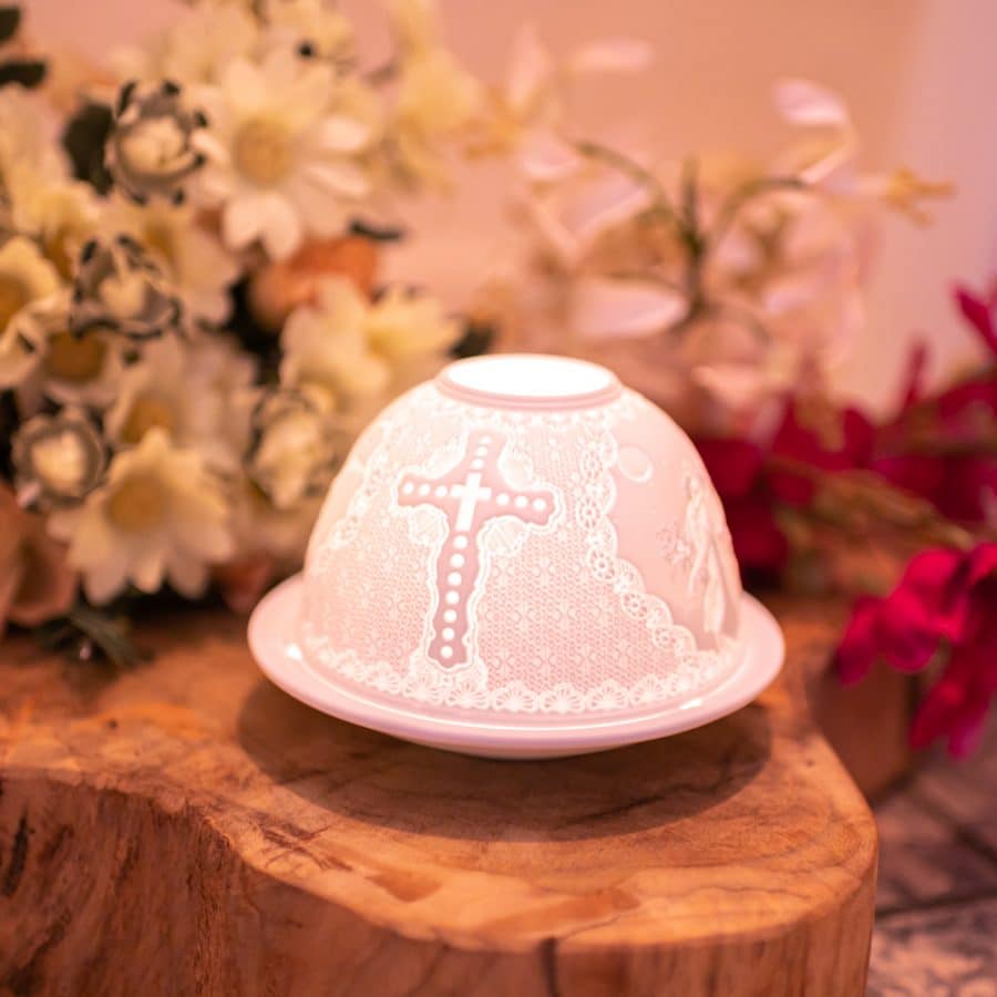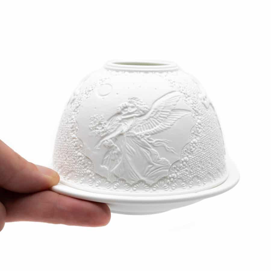 Diese leuchtenden Porzellanprodukte für Teelichter werden aus einer speziellen, sehr feinen Tonart hergestellt. Hinzugefügte Komponenten erzeugen den Leuchteffekt durch die fast transparente Keramik, die zwar unglasiert ist, aber dennoch eine glatte Oberfläche aufweist. Erfahrene Künstler haben eine zauberhafte Handwerkskunst geschaffen, mit besonders geprägten Details. Aus jedem Blickwinkel sieht man etwas anderes. Das Betrachten dieser Stimmungsmacher ist eine Zen-erfüllte Tätigkeit! Die Stimmungsmacher aus Porzellan sind sehr zerbrechlich. Außerdem sind sie von Natur aus weiß, aber sie leuchten gelb, wenn ein Teelicht in ihnen brennt.