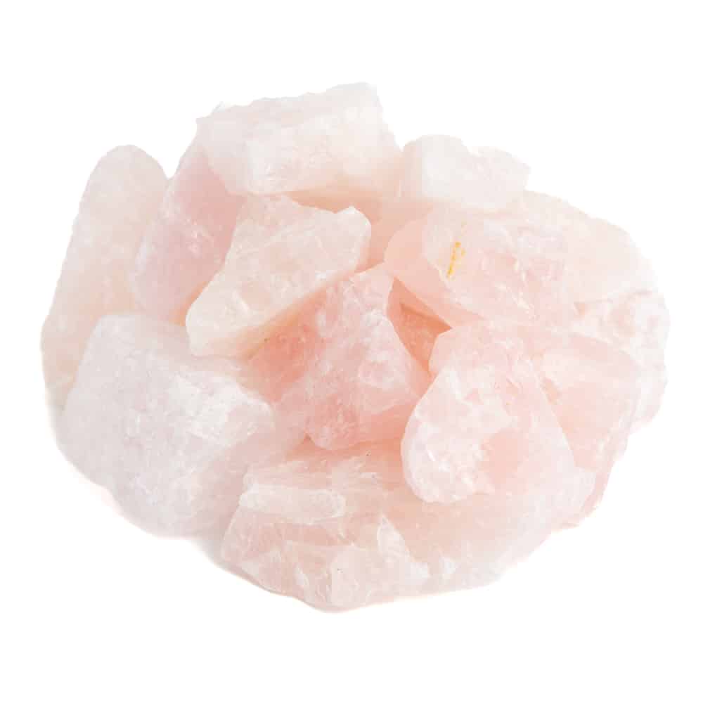 Rohes Stück Rosenquarz von 2 ~ 8 cm aus Brasilien. Ein Edelstein in seiner rohesten Form. Die Formen und Größen variieren von Stein zu Stein, da es sich um ein Naturprodukt handelt. Manchmal erhalten Sie ein rundes Stück, aber gelegentlich auch ein langes, dünnes Stück. Die Farben des Rosenquarzes variieren von (sehr) hell- bis dunkelrosa.