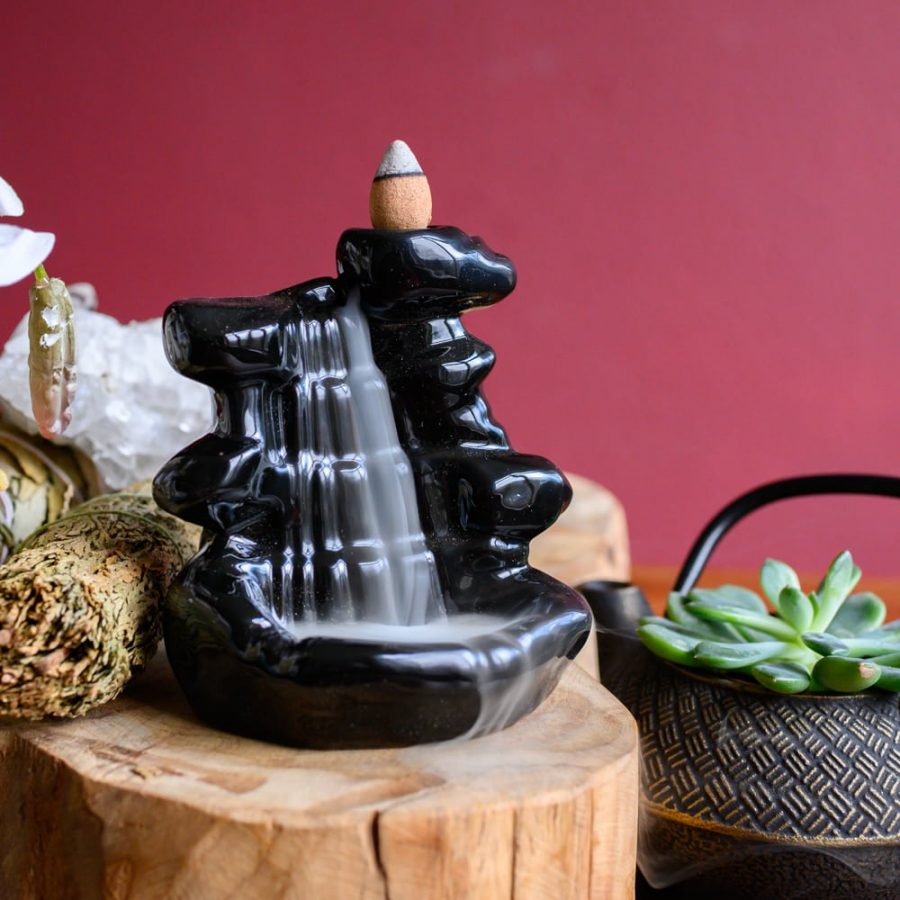 Eine schöne Rückfluss Räucherstäbchen Brenner in der Form eines Wasserfalls. Diese besondere Weihrauchbrenner gibt einen einzigartigen Effekt! Dies liegt daran, dass der Rauch nicht steigen, sondern fällt nach unten aus dem Wasserfall. Die Größe des Brenners ist 8 x 7 x 8 cm. Der Brenner ist aus Keramik gefertigt und kann Unregelmäßigkeiten in der Bemalung enthalten. Für den Backflow-Brenner werden spezielle Räucherkegel verwendet. Es wird empfohlen, den Backflow-Brenner auf einer feuerfesten Oberfläche mit einer zusätzlichen Schale darunter zu platzieren.