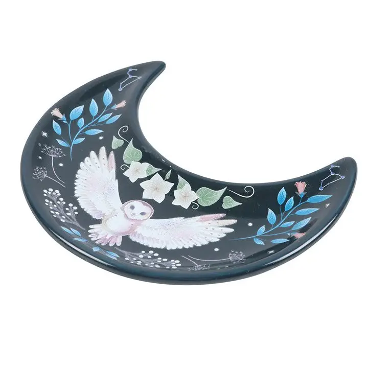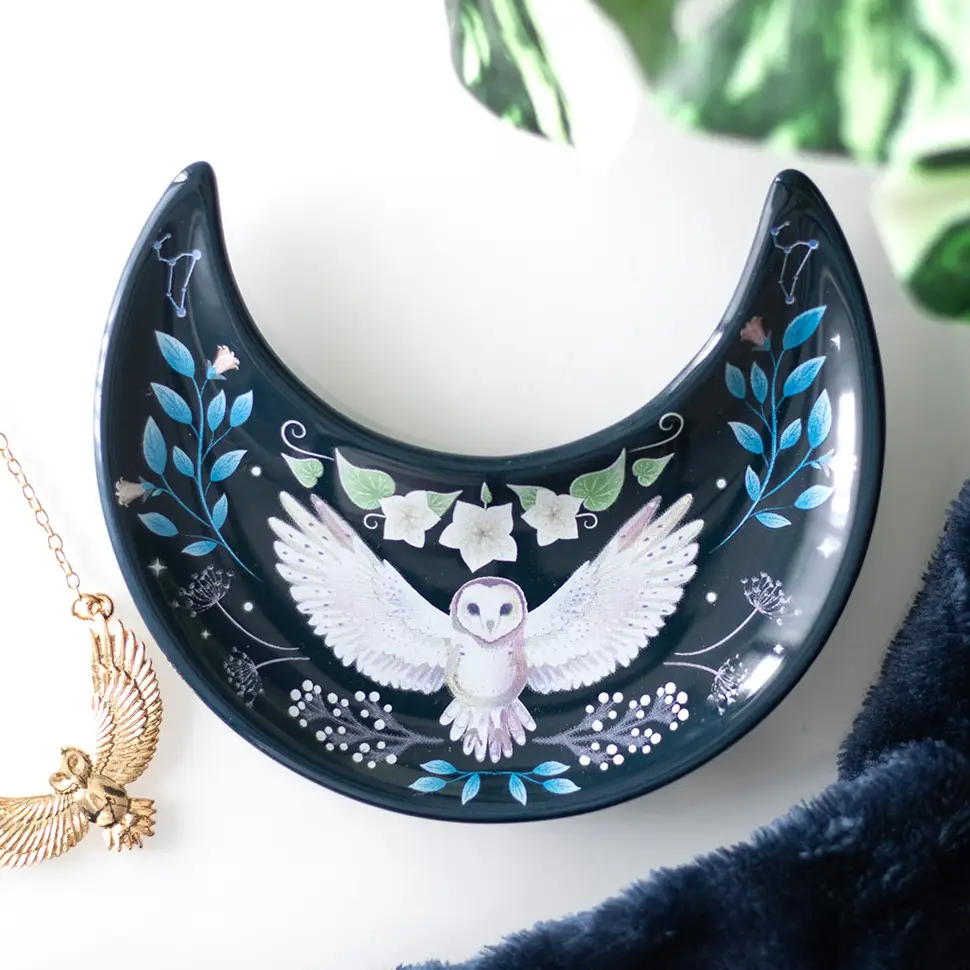 Diese Schmuckschale hat die Form einer Mondsichel und ist mit einer fliegenden Nachteule, umgeben von Waldpflanzen, verziert. Ein elegantes und mystisches Accessoire, perfekt für die Aufbewahrung von Schmuck oder kleinen Schätzen.