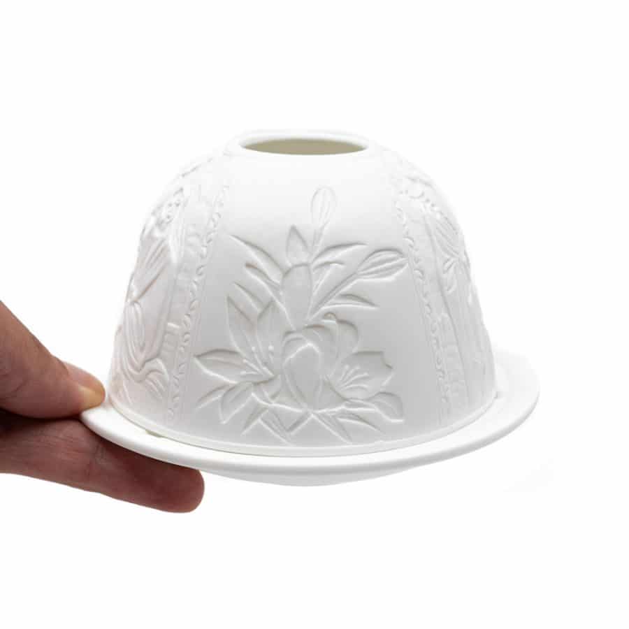 Deze porseleinen oplichtende producten voor waxinelichtjes zijn gemaakt van een speciale, zeer fijne kleisoort. Toegevoegde componenten zorgen voor het oplichtende effect door het bijna transparante aardewerk, dat niet geglazuurd is, maar toch een gladde afwerking heeft. Ervaren kunstenaars hebben magisch vakwerk afgeleverd, met bijzonder reliëfwerking, in prachtige details. Vanuit elke hoek zie je wat anders. Het kijken naar deze sfeermakers is een Zenvolle bezigheid! De porseleinen sfeerlichten zijn zeer breekbaar. Daarnaast zijn ze van nature wit maar zullen ze geel oplichten wanneer er een waxinelichtje in brandt.