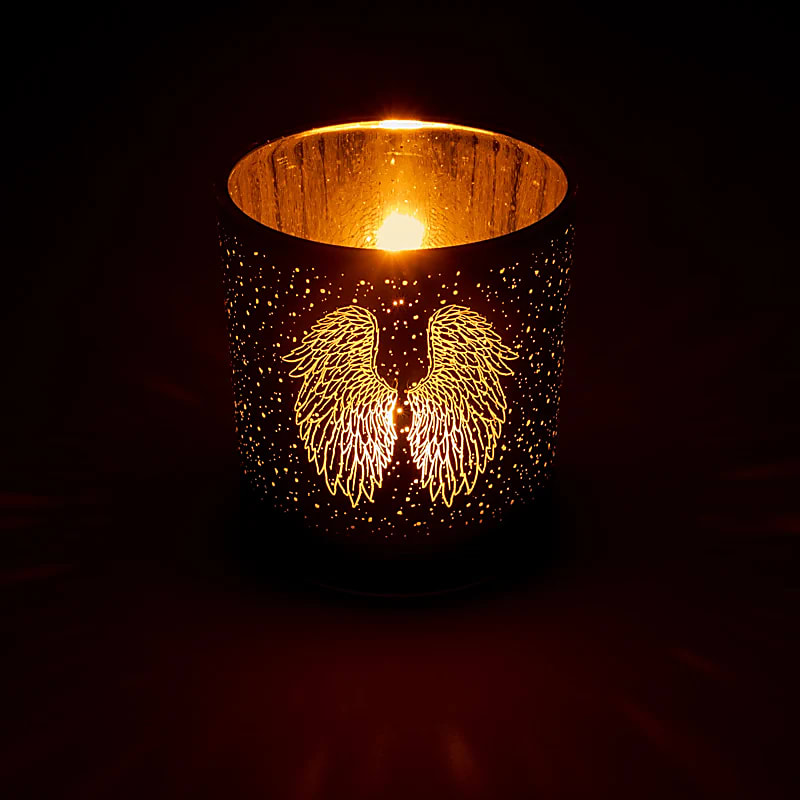 Engelsflügel symbolisieren Schutz, Trost und geistige Führung. Das mattierte Glas mildert das Kerzenlicht und schafft ein warmes, umhüllendes Aussehen - geeignet für Momente der Reflexion, der Erinnerung oder des inneren Friedens.