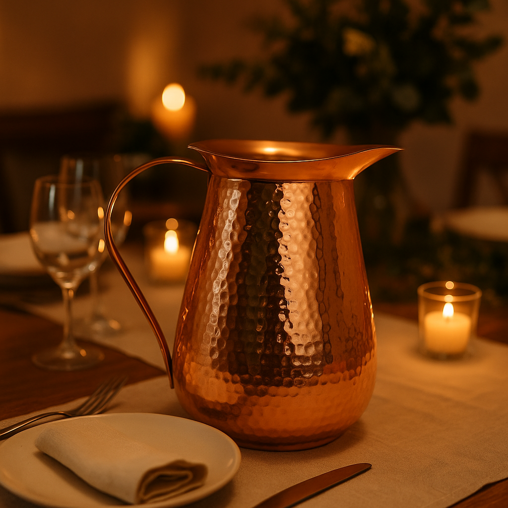 Diese einzigartigen Wasserkrüge aus Kupfer werden in Indien handgefertigt. Jeder Krug ist daher einzigartig und kann leicht von der Abbildung abweichen. Wenn Sie den Krug zum ersten Mal benutzen, empfehlen wir, ihn einige Male auszuspülen. Wasserkrüge aus Kupfer (tamba) werden in Indien seit über 200 Jahren hergestellt und verwendet. Nach dem alten indischen Ayurveda hilft das Trinken von Wasser aus einem Kupferkrug, die drei im menschlichen Körper zirkulierenden Energien, die Doshas (Vata - Luftelement, Kapha - Wasserelement und Pitta - Feuerelement) auszugleichen. Diese Krüge sind nur für Wasser geeignet. Nicht für Milch, Zitrusfrüchte und säurehaltige Liquistoffen. Kupfer verfärbt sich mit der Zeit durch Oxidation. Das Material kann auch ‘abfärben’. Dies sind beides natürliche Eigenschaften von Kupfer und beeinträchtigen das Trinken aus einer Kupferflasche oder einem Kupferkrug wie diesem nicht. Dies geschieht hauptsächlich auf der Innenseite. Die Kannen sind aus reinem Kupfer (99,6%; die äußere Schicht ist leicht lackiert). Das Innere besteht aus 100% Kupfer. Die Kannen können auch Unebenheiten aufweisen, die zu den natürlichen Eigenschaften von Kupfer gehören. Bei Verfärbungen kann es sich um dunkle Punkte / Flecken auf der Innenseite handeln. Außerdem können sie grün(ig) werden. Hinweise zur Reinigung und Pflege