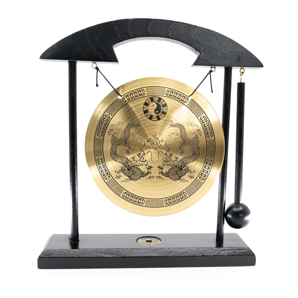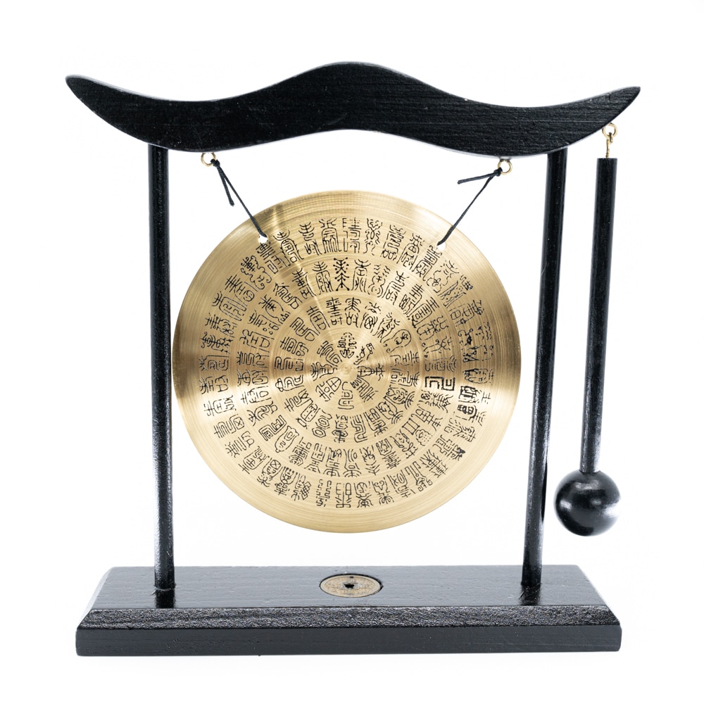 Ein traditioneller Feng Shui Tischgong mit den Maßen von ca. B=19cm x H=20cm. Der Durchmesser des Gongs beträgt 12,5 cm. Dies ist ein ornamentales Objekt.